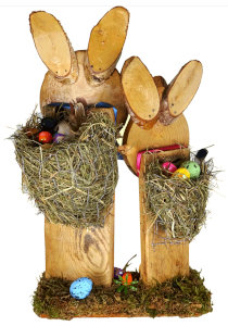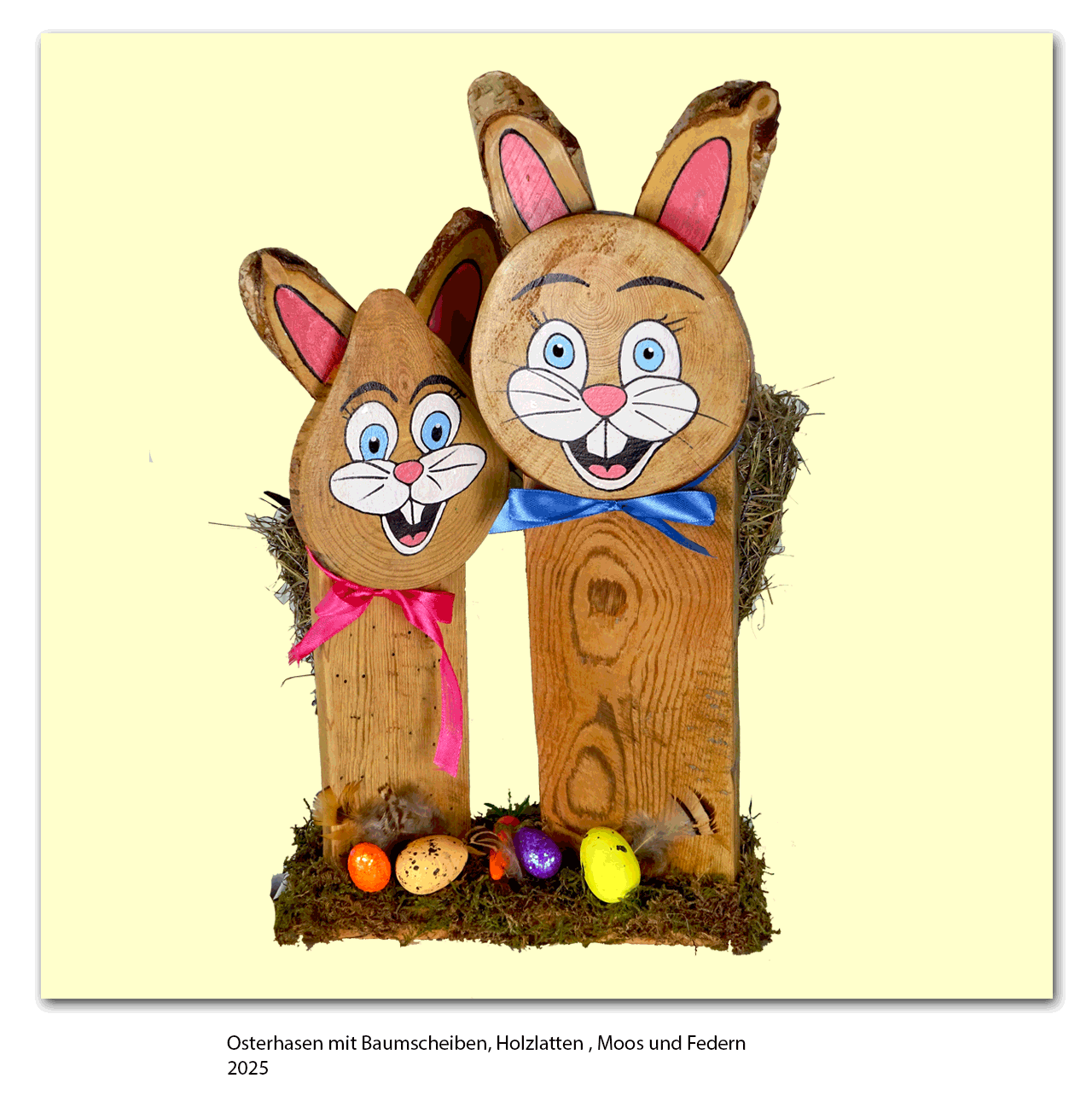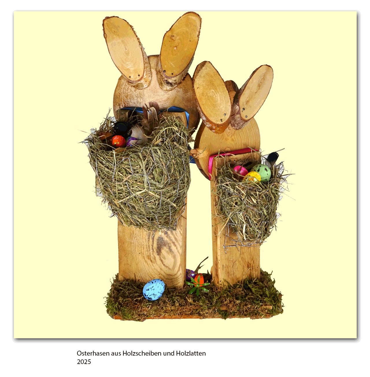 Osterhasen mit Baumscheiben, Holzlatten, Moos und Federn, 2025